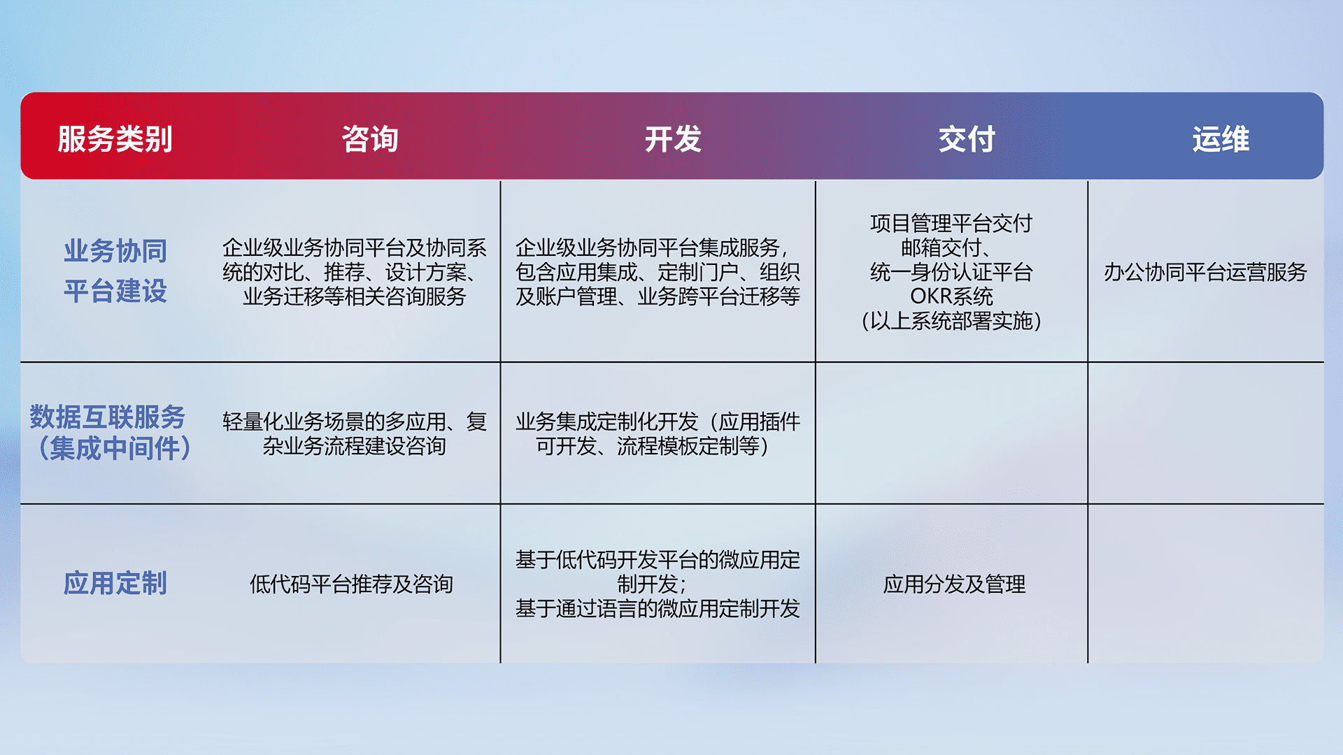 针对钉钉、、、企微、、、、IDaas等平台级产品提供产品的规划、、、、方案、、交付、、定制化开发等服务,,实现如统一协同办公、、、智能客户服务、、、、混合会议管理、、、、智能数据查询、、、、等业务场景,,,实现数字化转型。。。